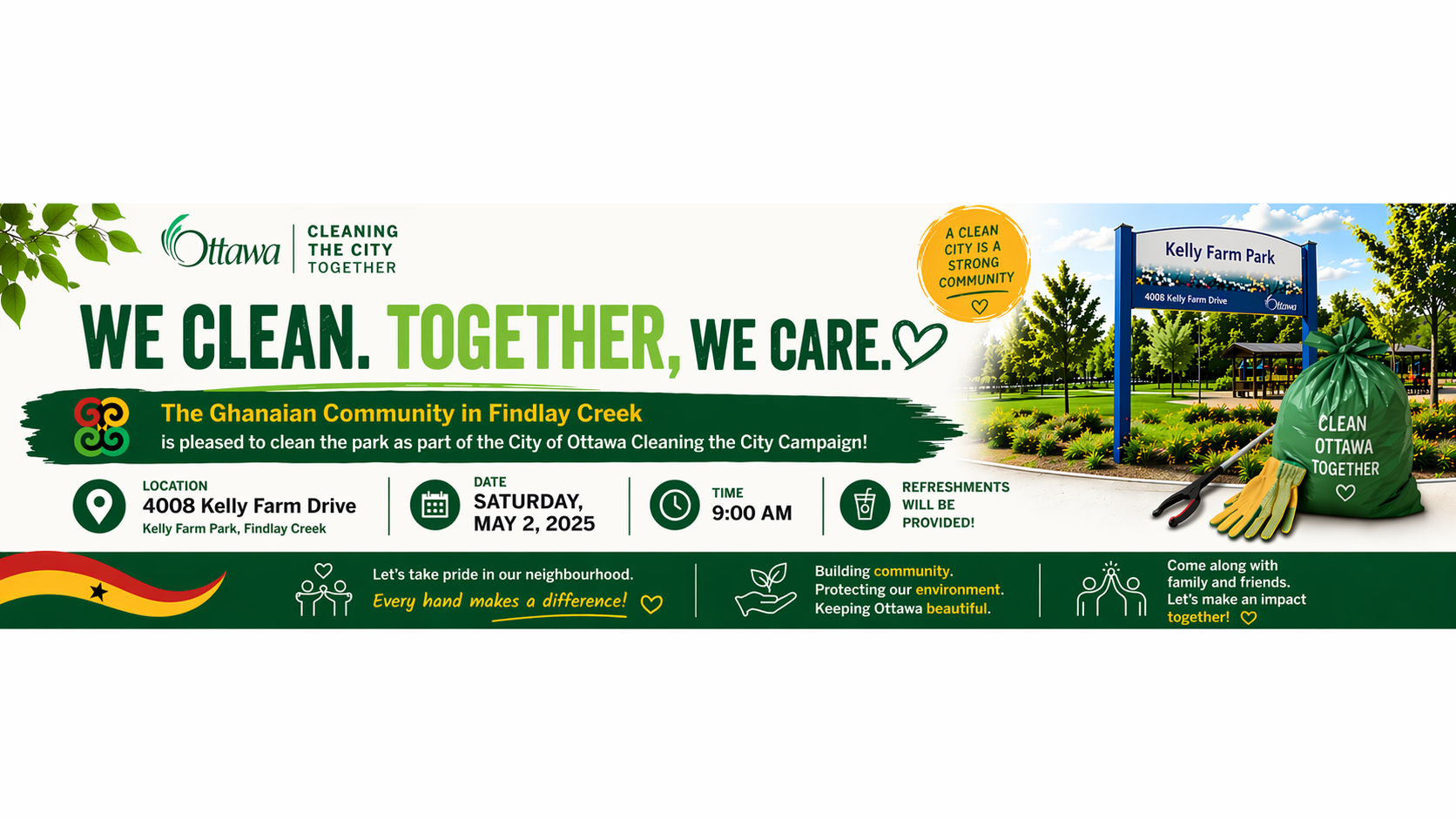 Join the Ghanaian Community in Findlay Creek as we proudly participate in the City of Ottawa’s Cleaning the City Campaign—a collective effort to keep our neighbourhood clean, safe, and beautiful.